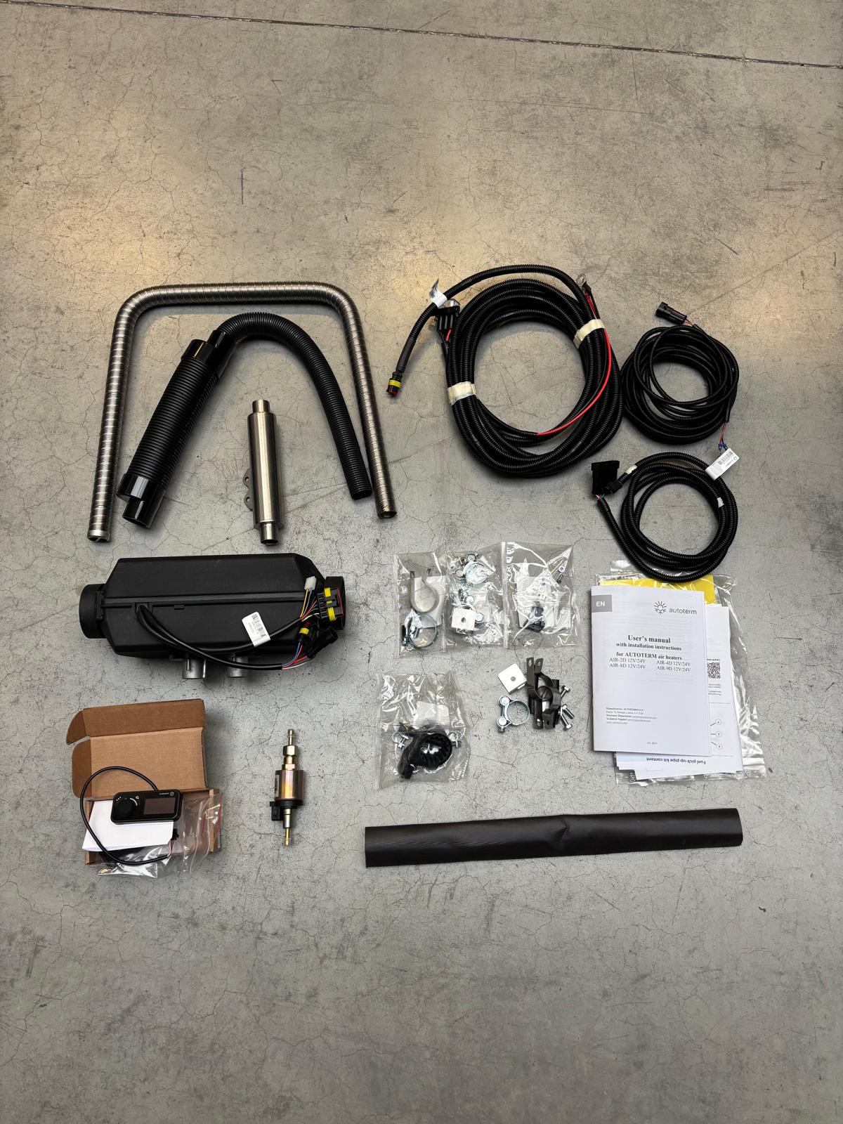 Complete dieselheater-set met Autoterm Air 2D 12V, Comfort Control bediening, RVS montageplaat en een aluminium onderbouwbehuizing voor montage onder de Mercedes Sprinter.
