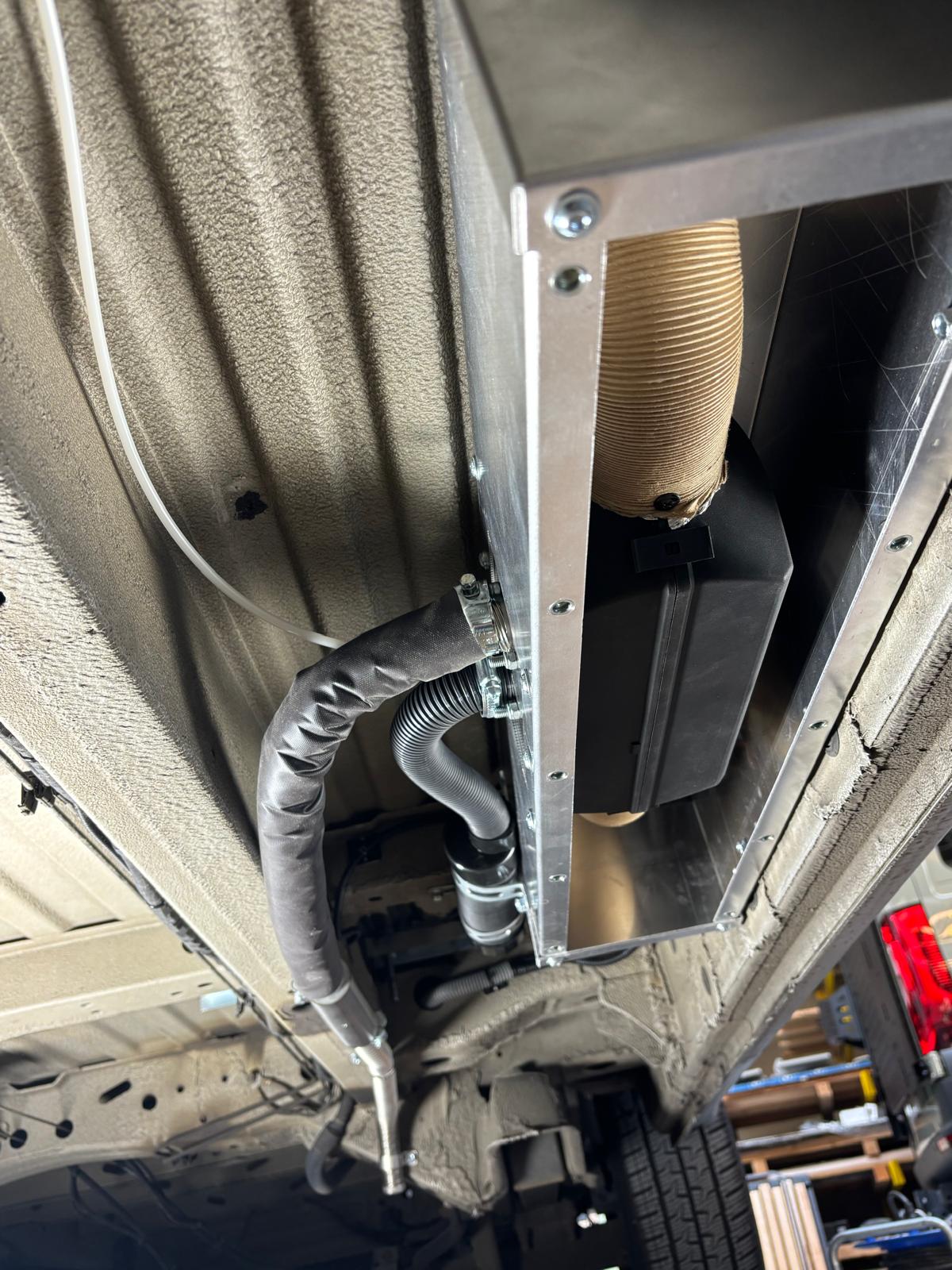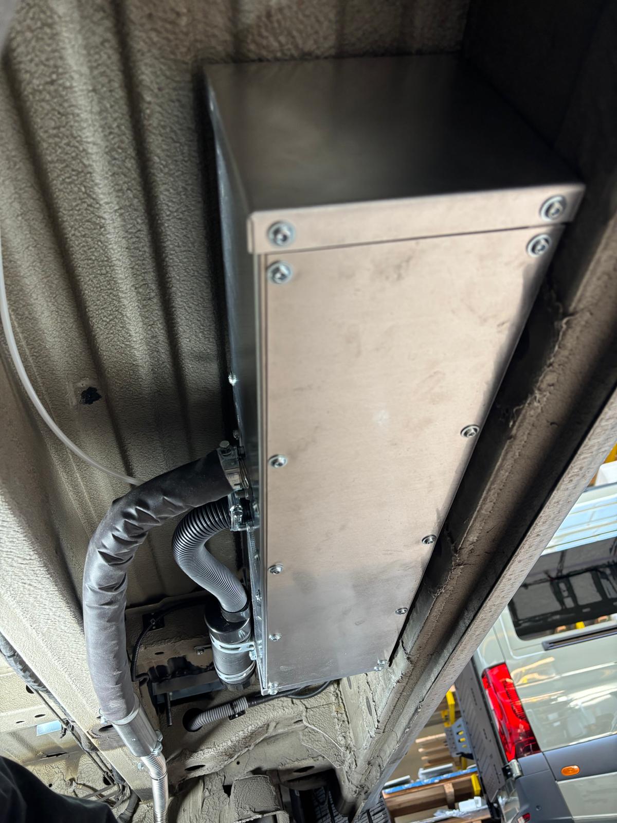 De dieselheater wordt door ons voorgemonteerd in de aluminium behuizing, waardoor installatie onder het voertuig eenvoudig en netjes gebeurt. De behuizing wordt onder de Sprinter gemonteerd en beschermt de heater tegen vuil, water en steenslag.