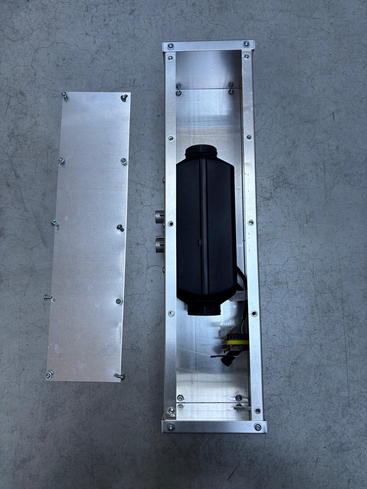 De aluminium behuizing is langer dan de heater zelf, waardoor de luchtinlaat en warme luchtuitlaat door de bodemplaat naar binnen kunnen worden geleid. Zo worden de buizen niet blootgesteld aan vuil of water onder het voertuig.