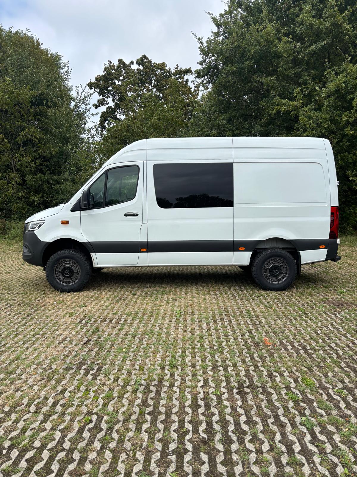 Complete bandenset voor de Mercedes Sprinter 4x4, bestaande uit Black Rhino Armory velgen met General Grabber AT3 all-terrain banden. Deze combinatie zorgt voor een stoere uitstraling en uitstekende prestaties op zowel asfalt als onverhard terrein.