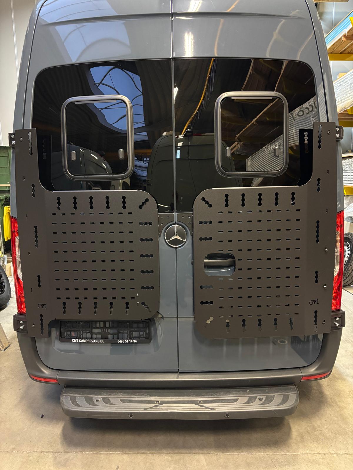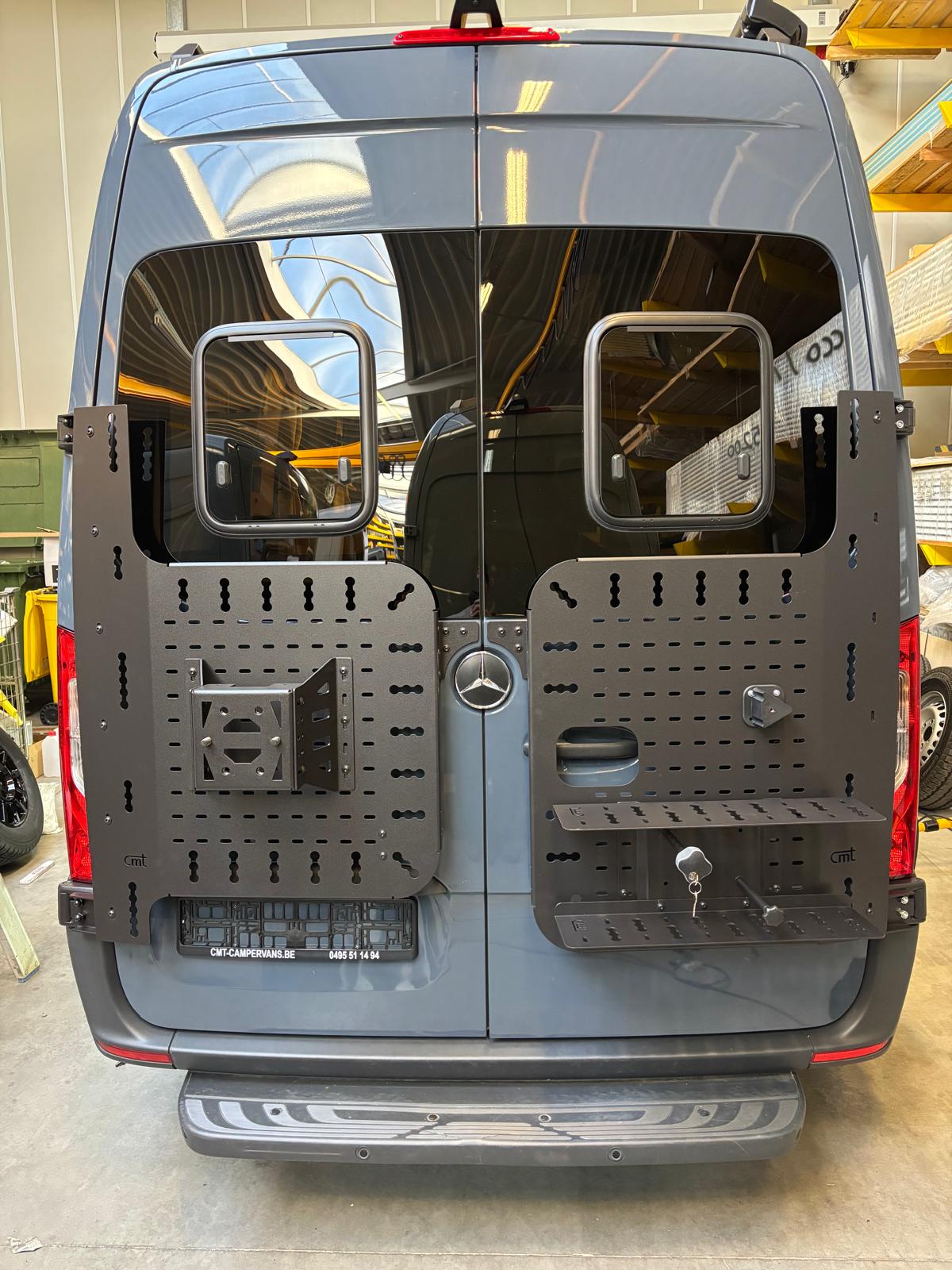 De cargo ladder staat 6 cm van de achterdeur, ook mét reservewiel blijf je binnen de Belgische wetgeving. De diepte-verstelbare reservewielhouder zorgt ervoor dat elk wielformaat gemonteerd kan worden.