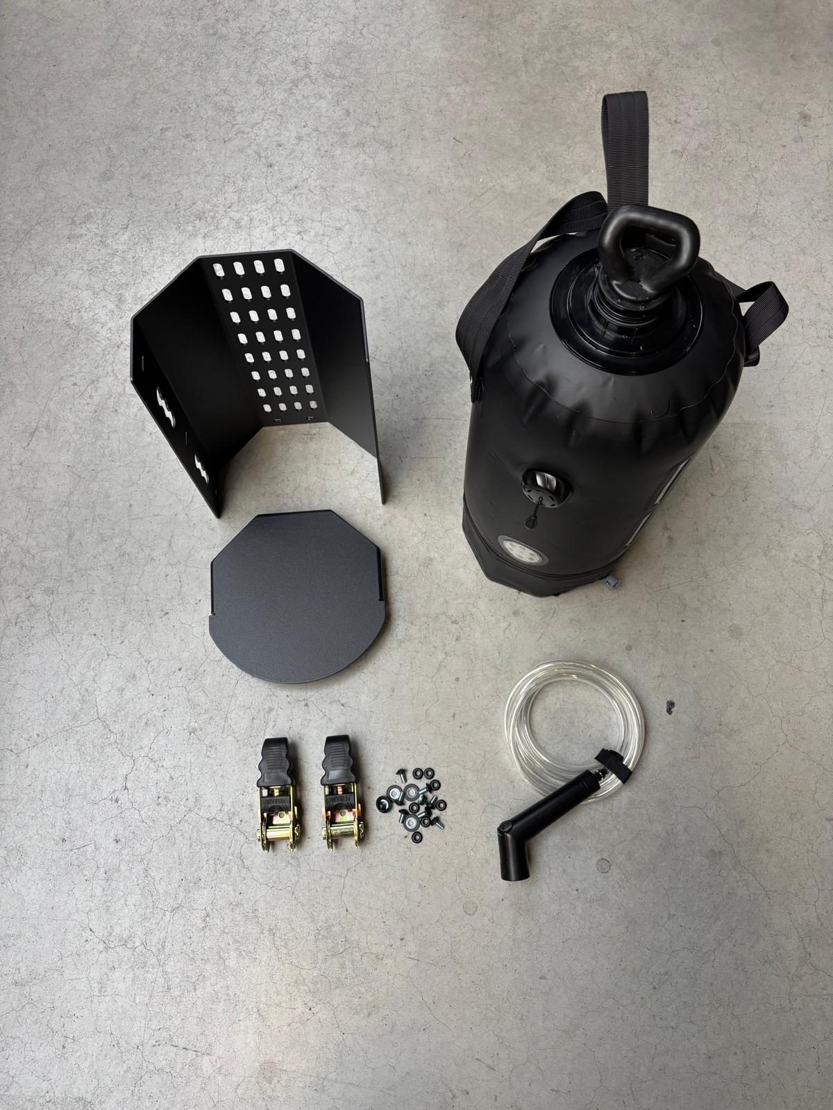 Aluminium houder voor het ophangen van een Quechua douchezak. Gemaakt uit 3 mm aluminium een weegt slechts 2 kg. Voorzien van trekriemen om de waterzak strak te spannen. Past plug-and-play op onze cargo ladders voor Mercedes Sprinter, op Vito (W447) te monteren met boren op je gewenste positie. Ideaal om te douchen, handen te wassen of fietsen af te spoelen. Geschikt voor warm water. Snelkoppeling voor de slang maakt aansluiten en losnemen heel eenvoudig. Douchezak inbegrepen.