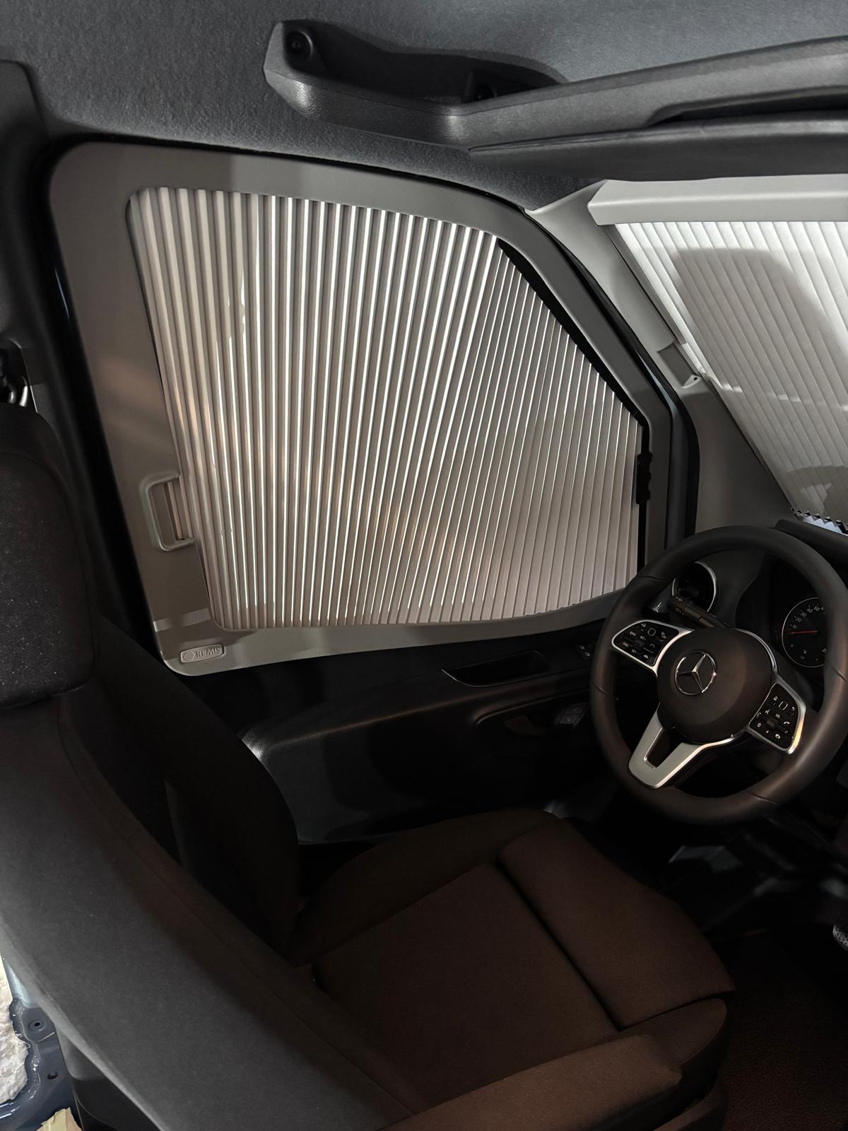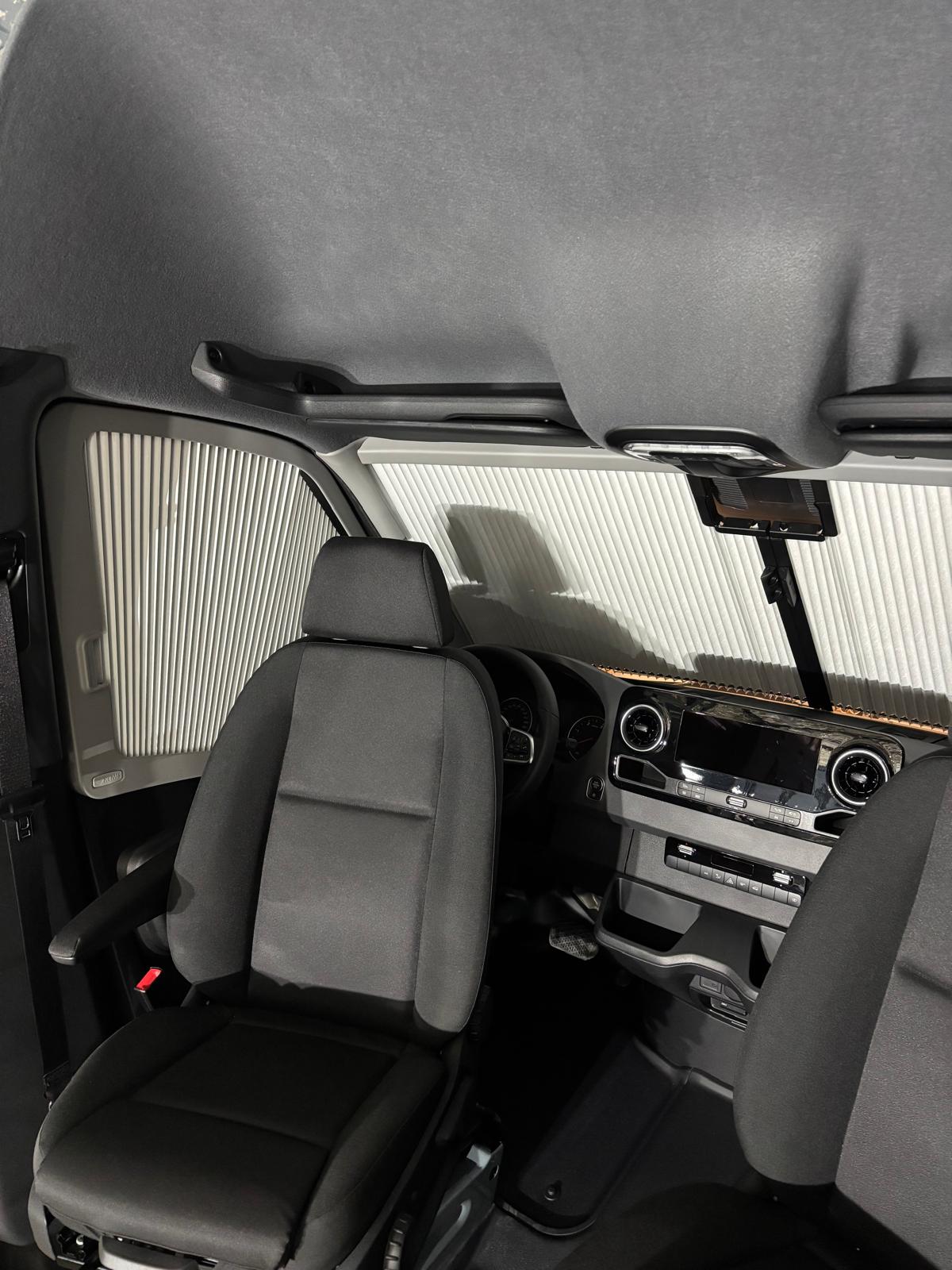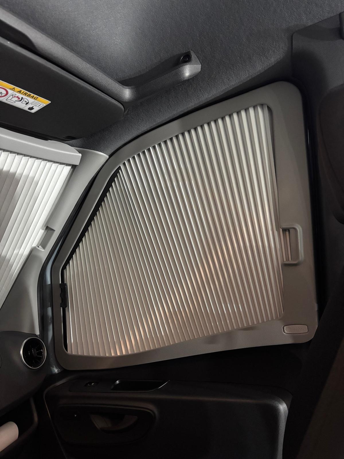 Verduisteringssysteem voor de zijruiten van de cabine (linksvoor & rechtsvoor) van de Mercedes Sprinter (2018+, 907/910). Beschikbaar voor voertuigen met handgreep en zonder handgreep in de deuropening. Zorgen voor bijna volledige verduistering, minder warmte in de zomer en betere isolatie in de winter.Set bevat 2 panelen: links + rechts. Voorruit verduisteringssysteem niet inbegrepen, wel apart verkrijgbaar in onze webshop.